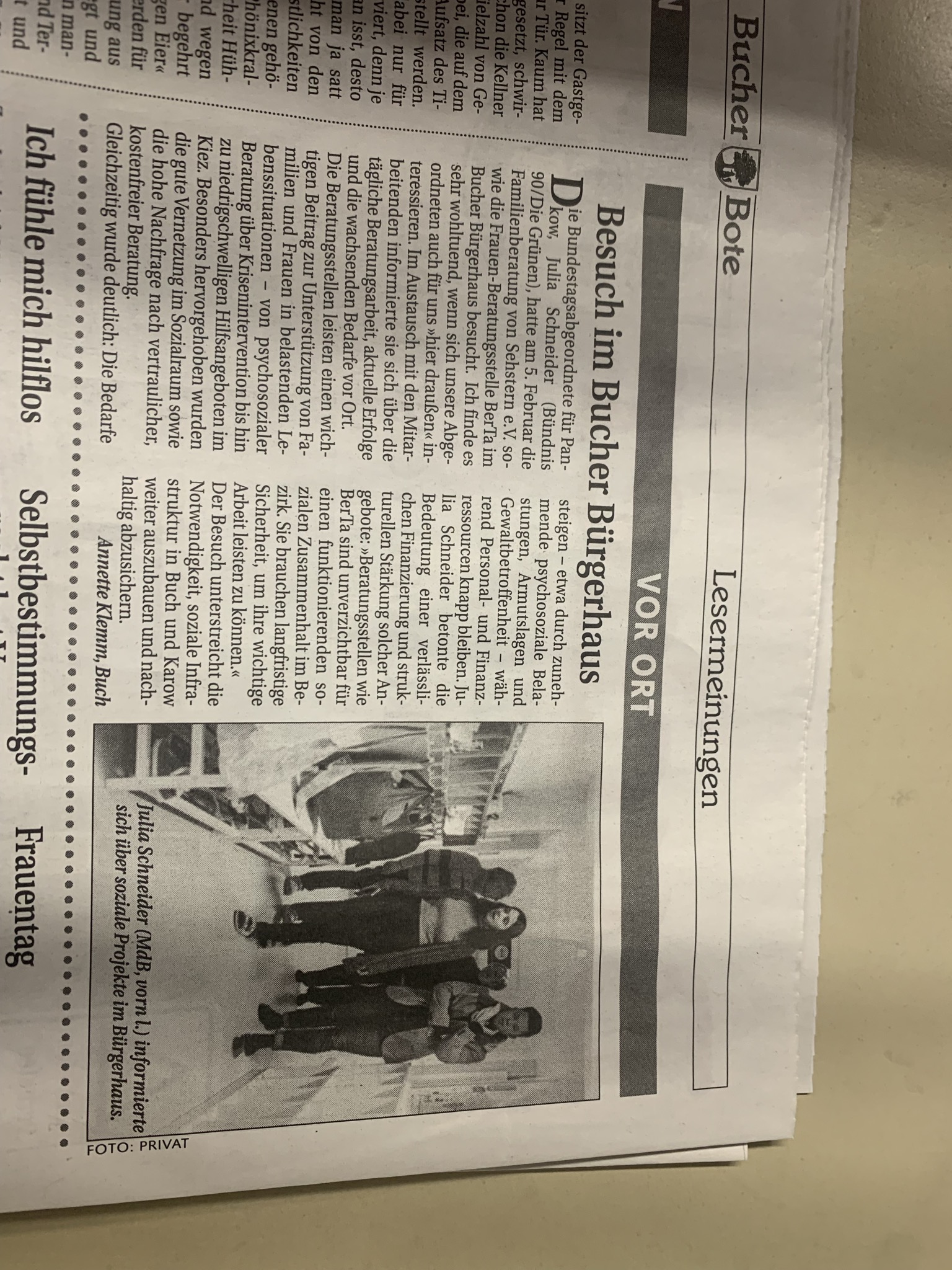 Die Bundestagsabgeordnete für Pankow, Julia Schneider (Bündnis 90/Die Grünen), hatte am 5. Februar die Familienberatung von Sehstern e.V. sowie die Frauen Beratungsstelle BerTa im Bucher Bürgerhaus besucht. Ich finde es sehr wohltuend, wenn sich unsere Abgeordneten auch für uns "hier draußen" interessieren.